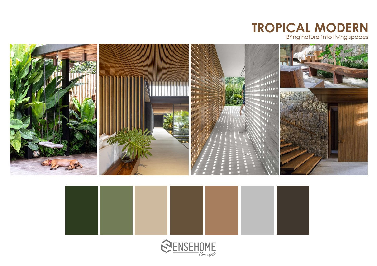 Dự án mang phong cách “ Tropical Modern” với mong muốn sẽ đem đến cho gia chủ một bầu không khí yên tĩnh, thanh bình, trong lành với gam màu xanh của lá cây và họa tiết từ thiên nhiên, kết hợp với đó là các nội thất hiện đại, mang lại trải nghiệm tiện nghi và thoải mái được cá nhân hóa