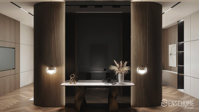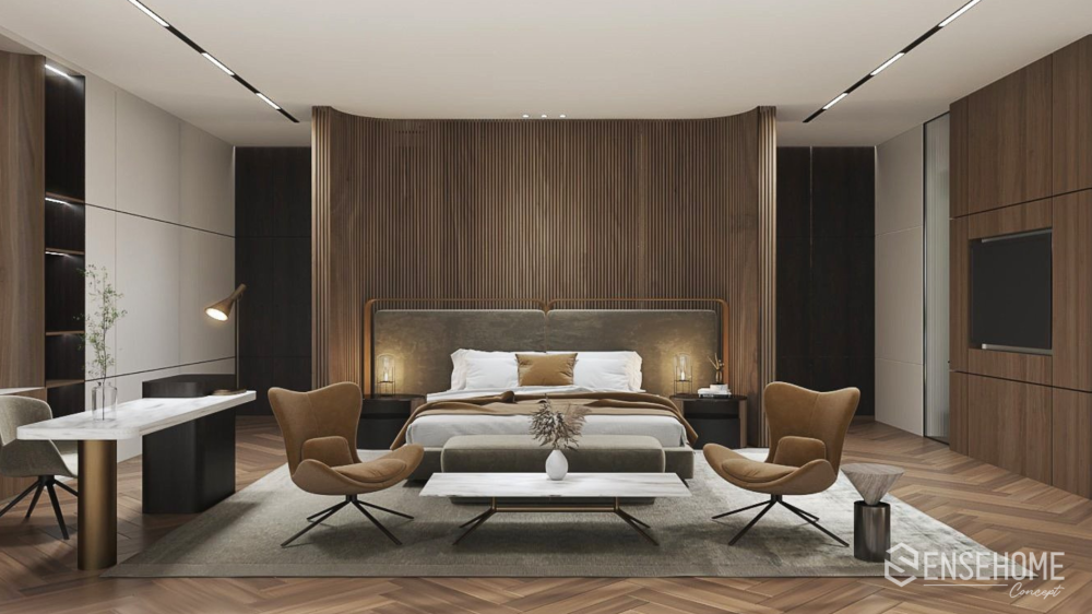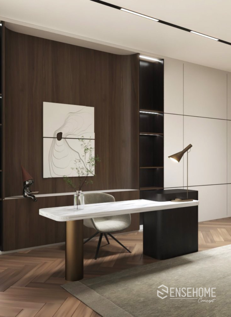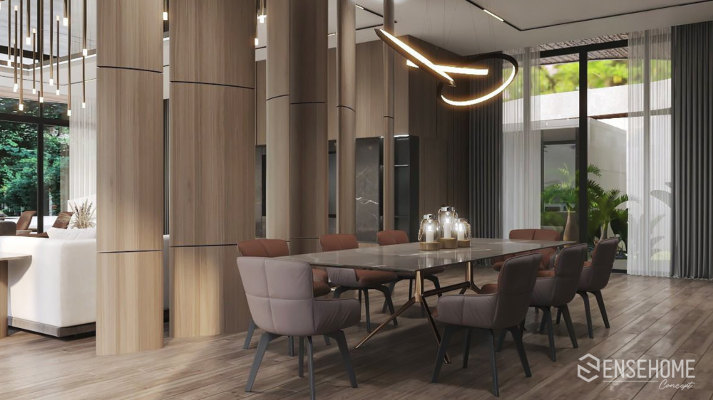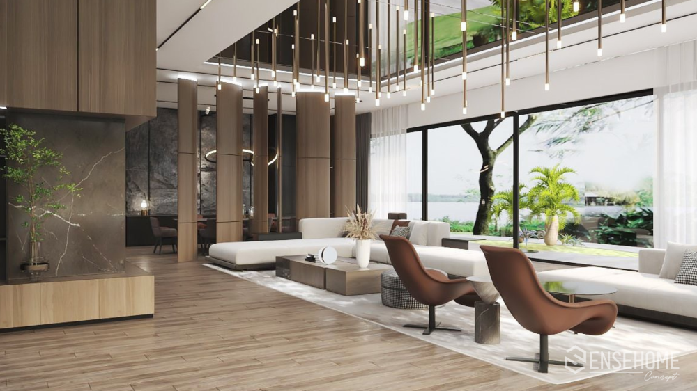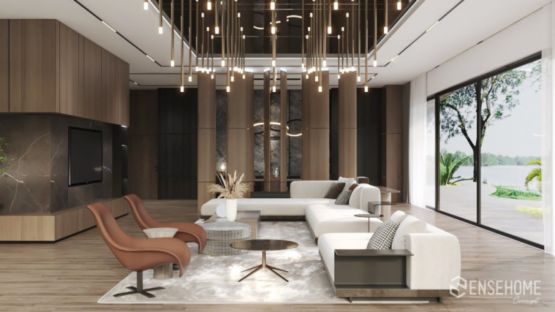 Từ bỏ lối kiến trúc cổ điển, phong cách hiện đại áp dụng theo quy tắc bố trí đồ vật, hình khối không gian theo hình thức tự do và phi cân xứng. Bảng màu đơn sắc: màu nâu, màu be, màu trắng, màu đen càng tạo nên sự sang trọng, tinh tế cho ngôi nhà. Tuy nhiên khi đặt chân vào không gian đó, gia chủ không hề cảm thấy lạnh lẽo hay lạc lõng, bởi sự tận dụng nguồn ánh sáng tự nhiên bao trùm và sưởi ấm lên mọi ngóc ngách. Ánh sáng tạo ra chiều sâu, chiều cao, điểm nhấn và giúp thu hút sự chú ý đến các khu vực muốn tạo ấn tượng. Sự cân bằng của ánh sáng và bóng tối mang lại những năng lượng mới