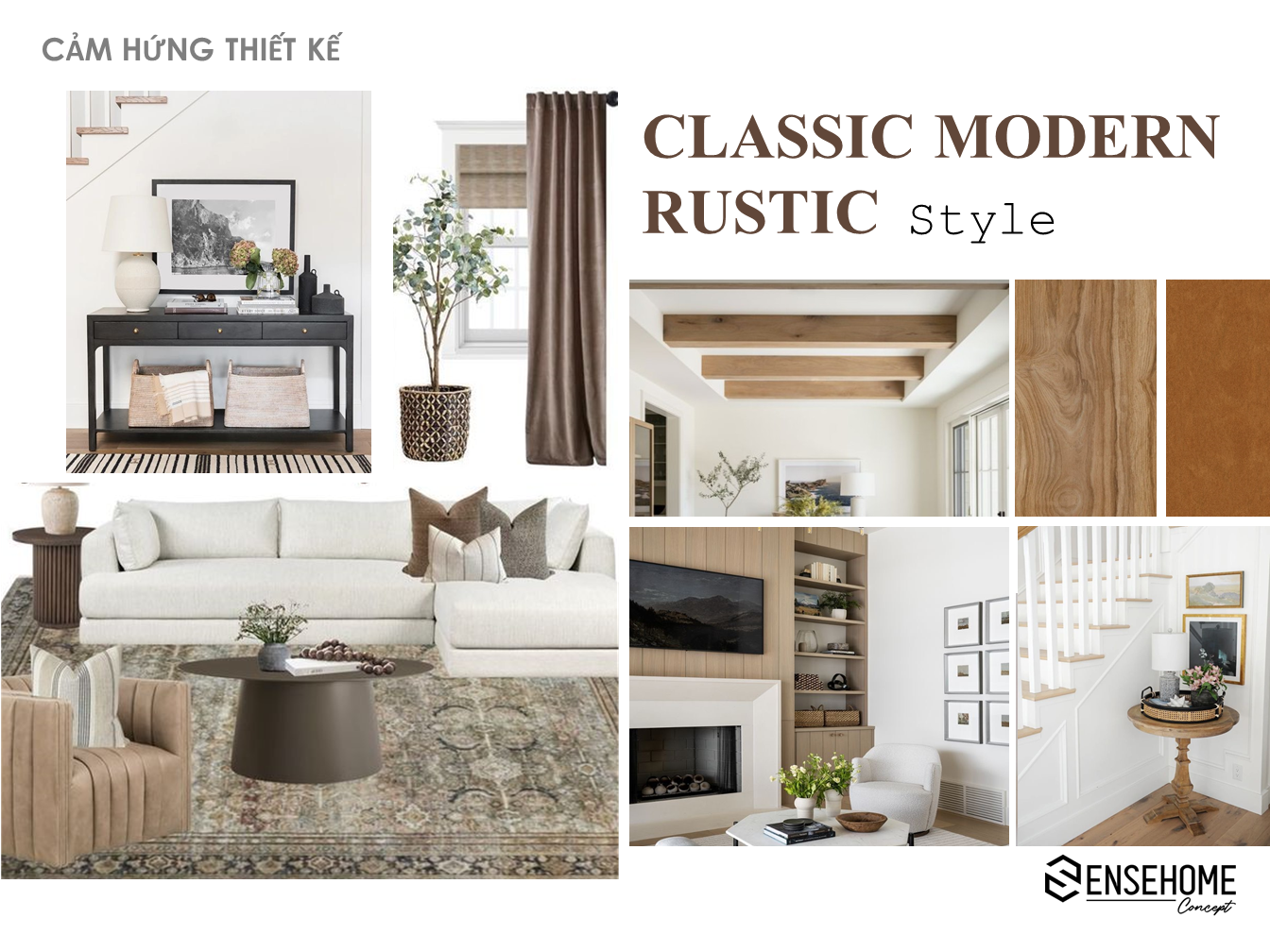 The Classic Modern Rustic space often utilizes calming colors such as brown, beige, white, and gray to establish a traditional ambiance. High-quality natural wood, with its distinctive grain patterns, is the predominant material, creating a warm and nature-inspired atmosphere.