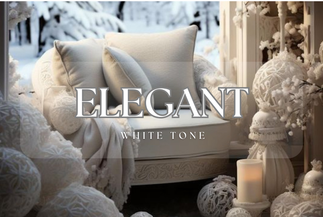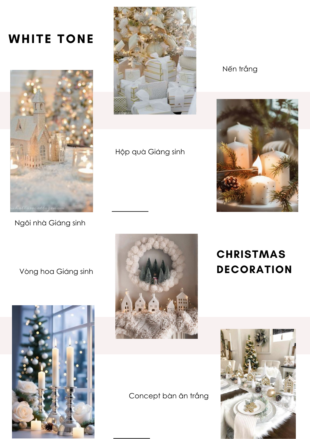 Tone trắng: Màu trắng thường được sử dụng để tượng trưng cho tuyết và sự thuần khiết. Trắng cũng là màu chủ đạo trong trang trí giáng sinh, tạo nên cảm giác thanh lịch và trong trẻo.