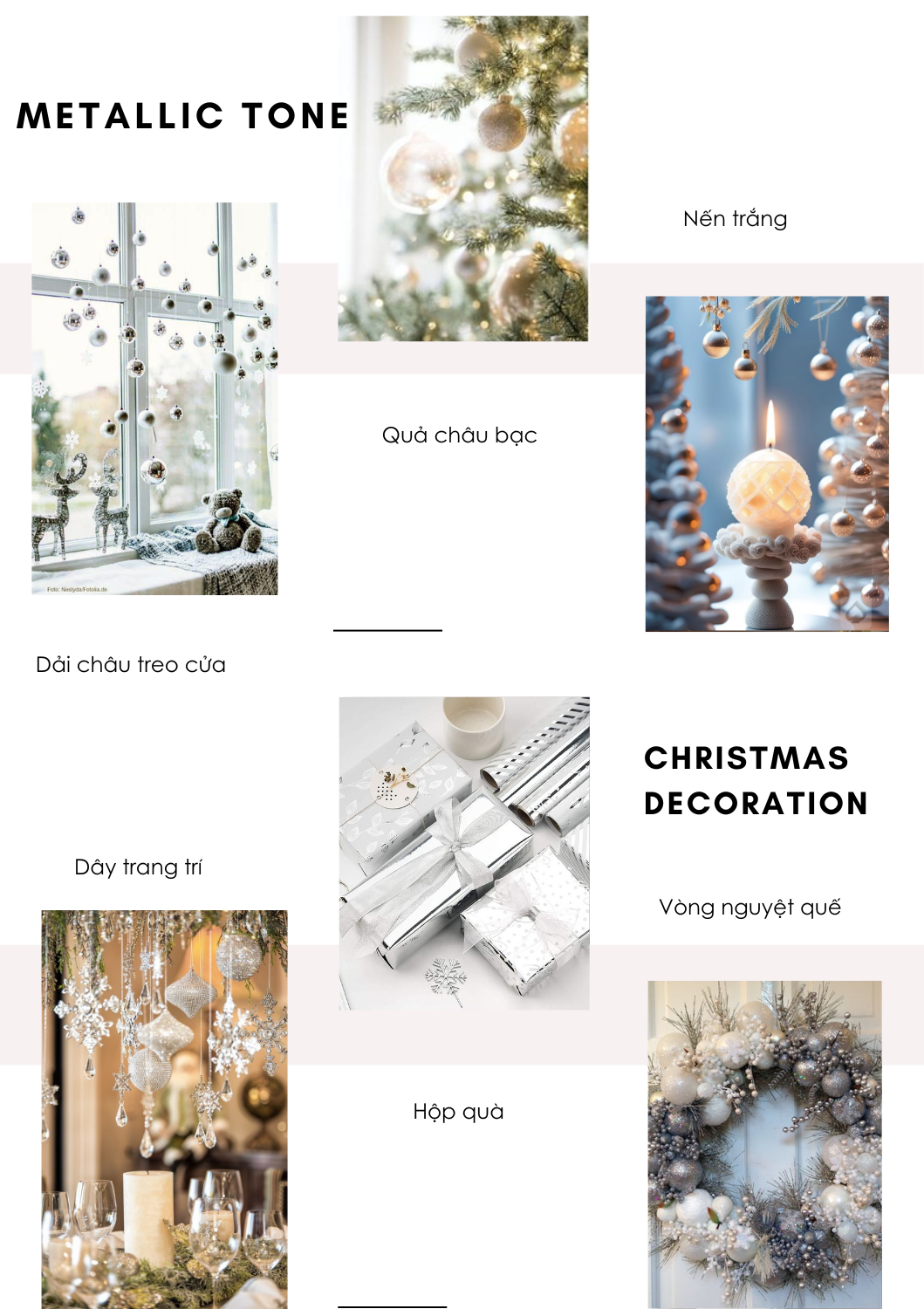 Tone bạch kim: màu sắc này thường được sử dụng để tạo điểm nhấn và mang lại cảm giác sang trọng. Bạch kim thường được liên kết với quà tặng và long lanh của mùa lễ hội.