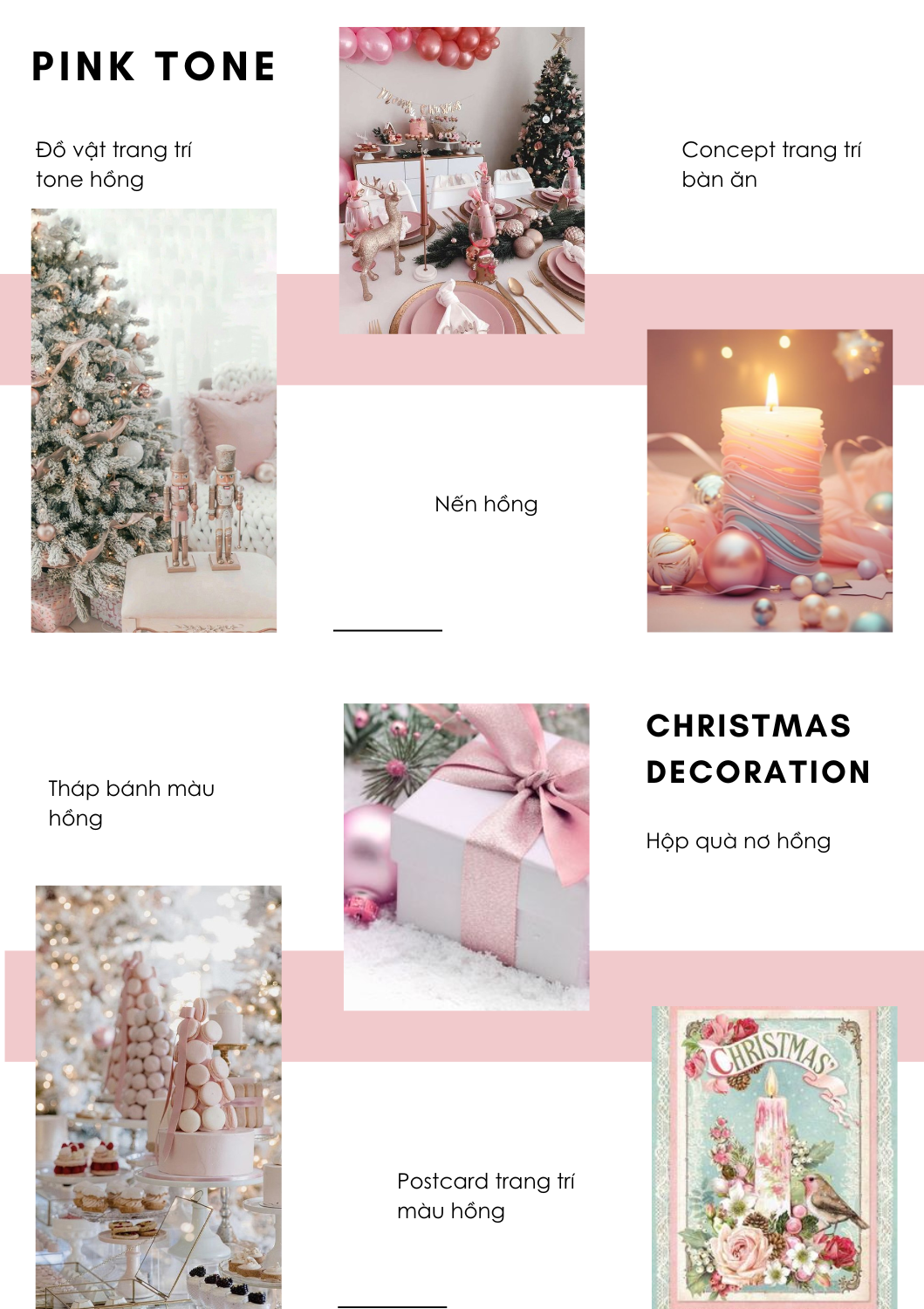 Tone hồng: Màu hồng trong trang trí giáng sinh mang lại một nét dịu dàng, ngọt ngào và đôi chút nữ tính cho không gian lễ hội. Dù không phải là màu sắc chủ đạo như đỏ hay xanh lá cây, màu hồng thường được sử dụng như một điểm nhấn để làm cho không gian trở nên ấm cúng và đáng yêu hơn.