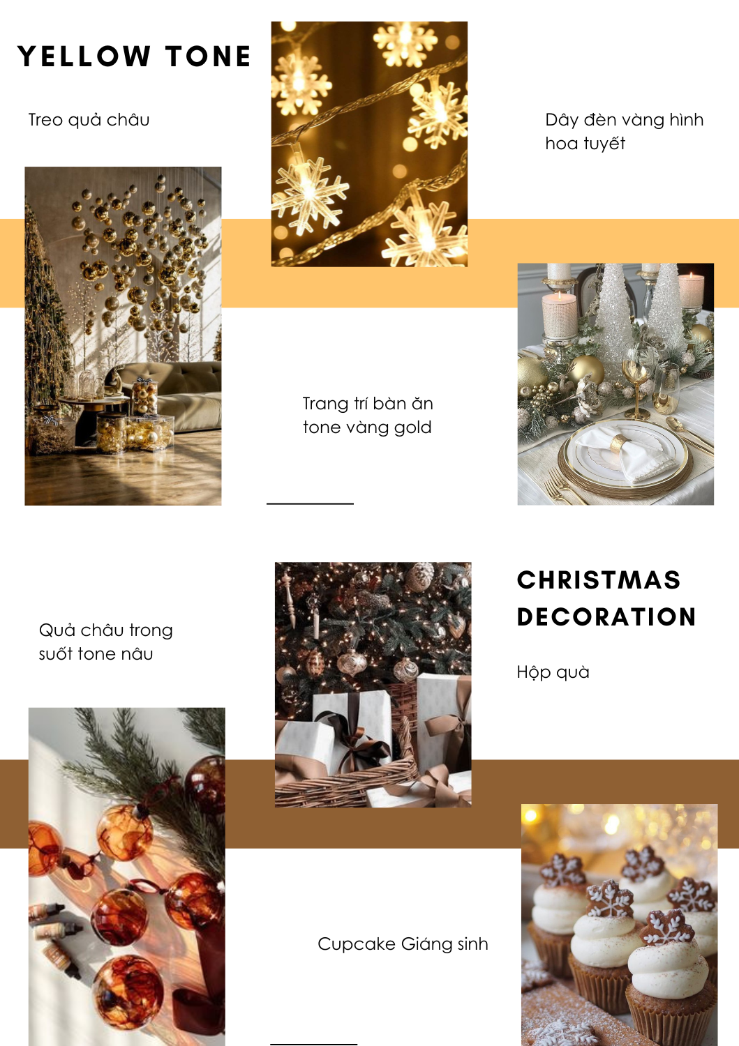 Tone Vàng và nâu: Vàng và nâu thường được liên kết với mùa thu và mùa đông. Chúng mang đến cảm giác ấm cúng và thường được sử dụng để biểu tượng cho đèn vàng của nến và đèn trang trí.