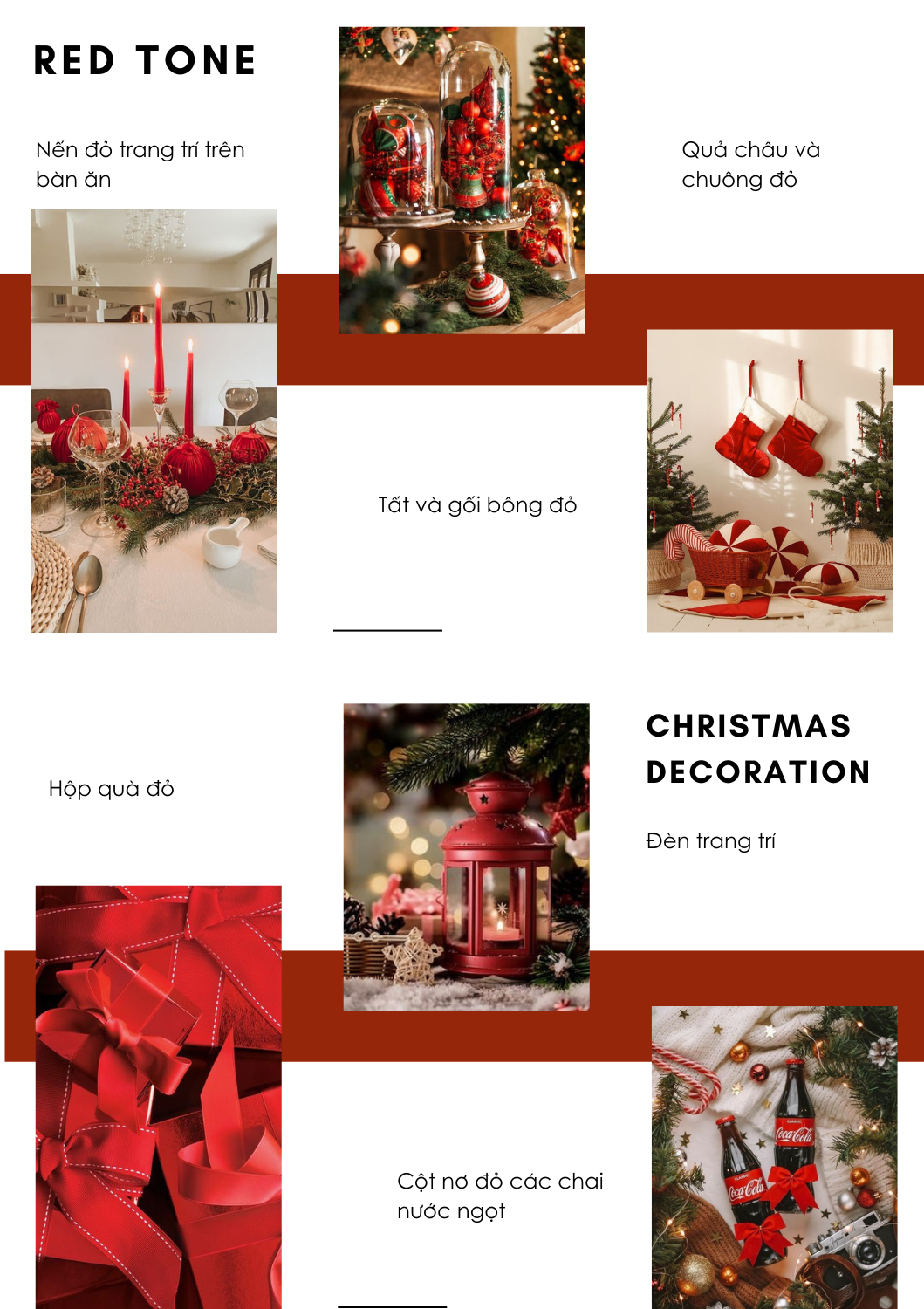 Tone đỏ: Màu Đỏ thường được liên kết với tình yêu, sự ấm áp, và niềm vui. Nó là một trong những màu chủ đạo của Giáng sinh, tượng trưng cho sự sống và lòng nhân ái.