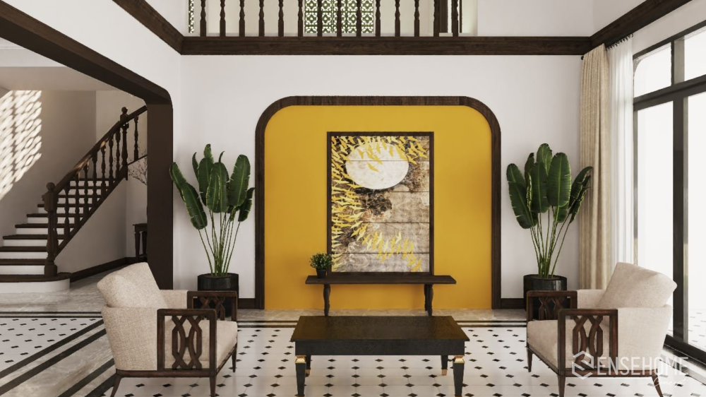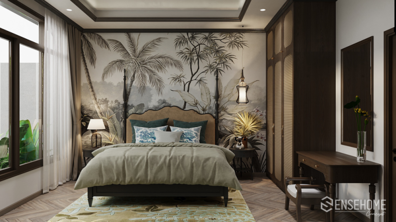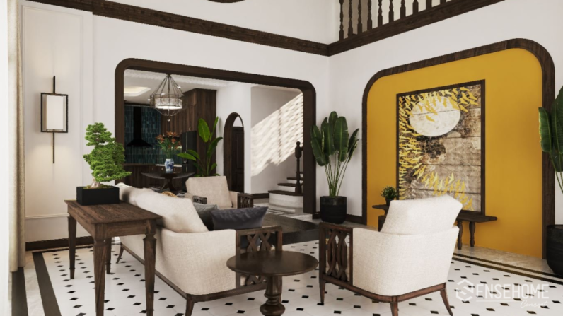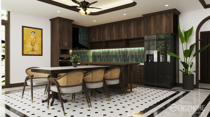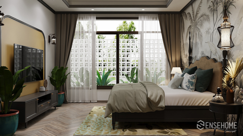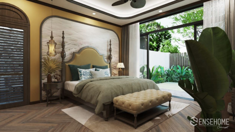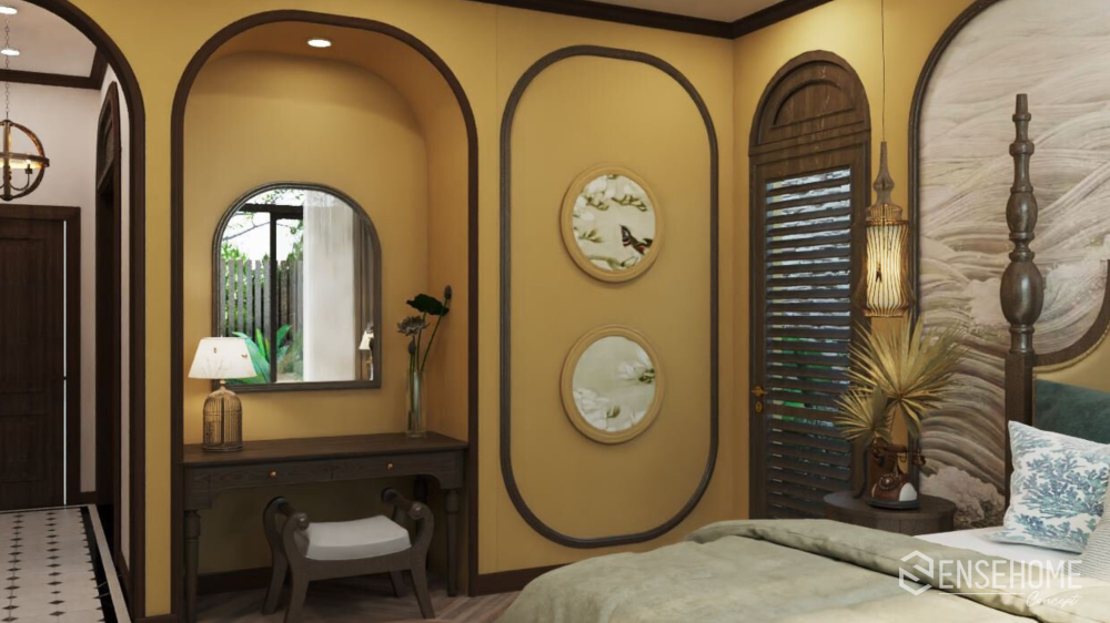 Phong cách Indochine quay trở lại và khẳng định vị thế của một thiết kế làm “ sống lại” những dấu ấn của thời gian của một gia đình Việt truyền thống giao thoa với chất lãng mạn trong kiến trúc phương Tây. Màu sắc chủ đạo phù hợp với khí hậu của miền nhiệt đới. sự ấm áp của màu vàng và sự trầm tĩnh của màu nâu nhạt tạo nên màu vàng cát kết hợp với tone đen huyền bí, điểm thêm sự nổi bật của màu xanh ngọc bích tạo cảm giác tươi mới, thư thái và êm dịu. Ngoài ra, màu xanh ngọc còn mang biểu tượng của sự quyền quý, thanh thoát và may mắn. SENSEHOME CONCEPT tạo nên một ngôi nhà với tinh thần an dưỡng với an trong an yên và dưỡng trong dưỡng sức. Hãy để bão tố dừng sau cánh cửa kia vì mỗi khi trở về nhà, ta lại thong thả với cuộc sống yên bình của chính chúng ta